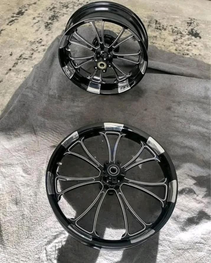 Black chrome multi-spoke motorcycle wheels deliver an unbeatable combination of stealthy aggression and premium shine. These rims feature a dominant gloss black base with precise chrome accents on the spokes, hub details, and outer lip—creating a stunning contrast cut effect that’s become a top trend in custom Harley-Davidson, cruiser, and chopper builds.