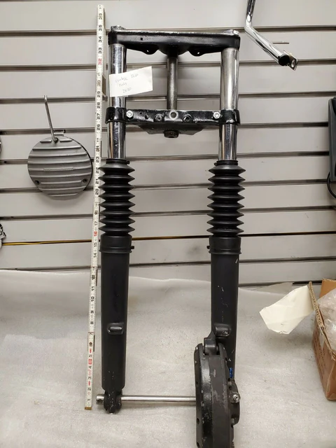 Old Skool Wide Glide Forks . Harley FLH Shovelhead Panhead Chopper . 41mm Brake . OEM . Early Panhead trees, bottom one is shaved… little extended, even comes with the factory brake caliper & axle  nice set of original panhead triple trees for hydraglide duo glide 1949-1959…. came with a panhead chopper .